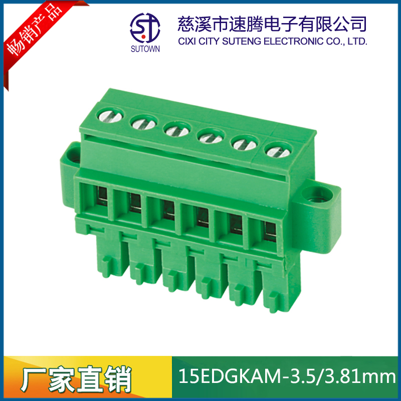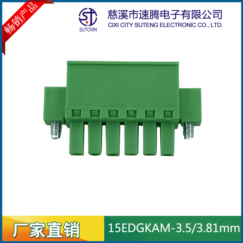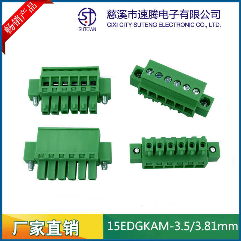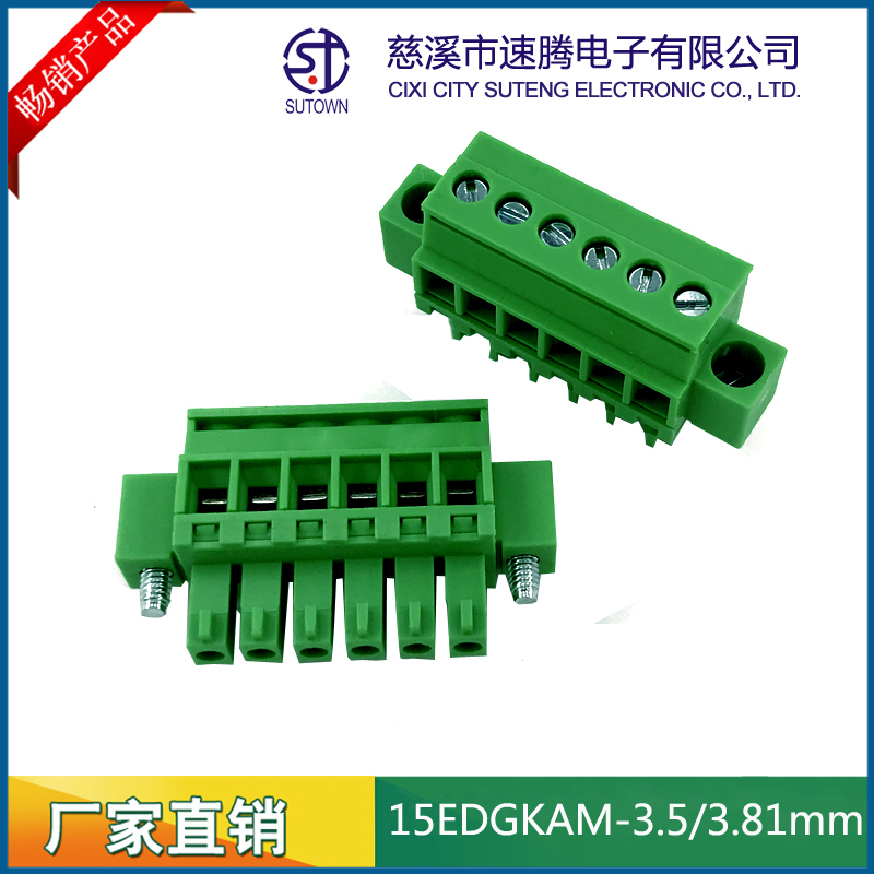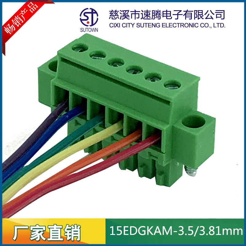 间距:3.5/3.81mm材质及电镀 触点材料 : 磷青铜 螺丝 :M2.5 钢 镀锌 方块:铜,镀镍 塑 件 : PA66 UL94V-0 电气性能额定电压: 300V额定电流: 8A接触电阻: 20mΩ绝缘电阻: 5000MΩ\1000V耐电压: AC1500V\1Min使用线径: 28-12AWG 2.5mm2;机械性能温度范围: -40℃~+105℃瞬时温度: +250℃ 5秒扭力:0.5Nm(4.5lb.in)剥线长度:5-6mm