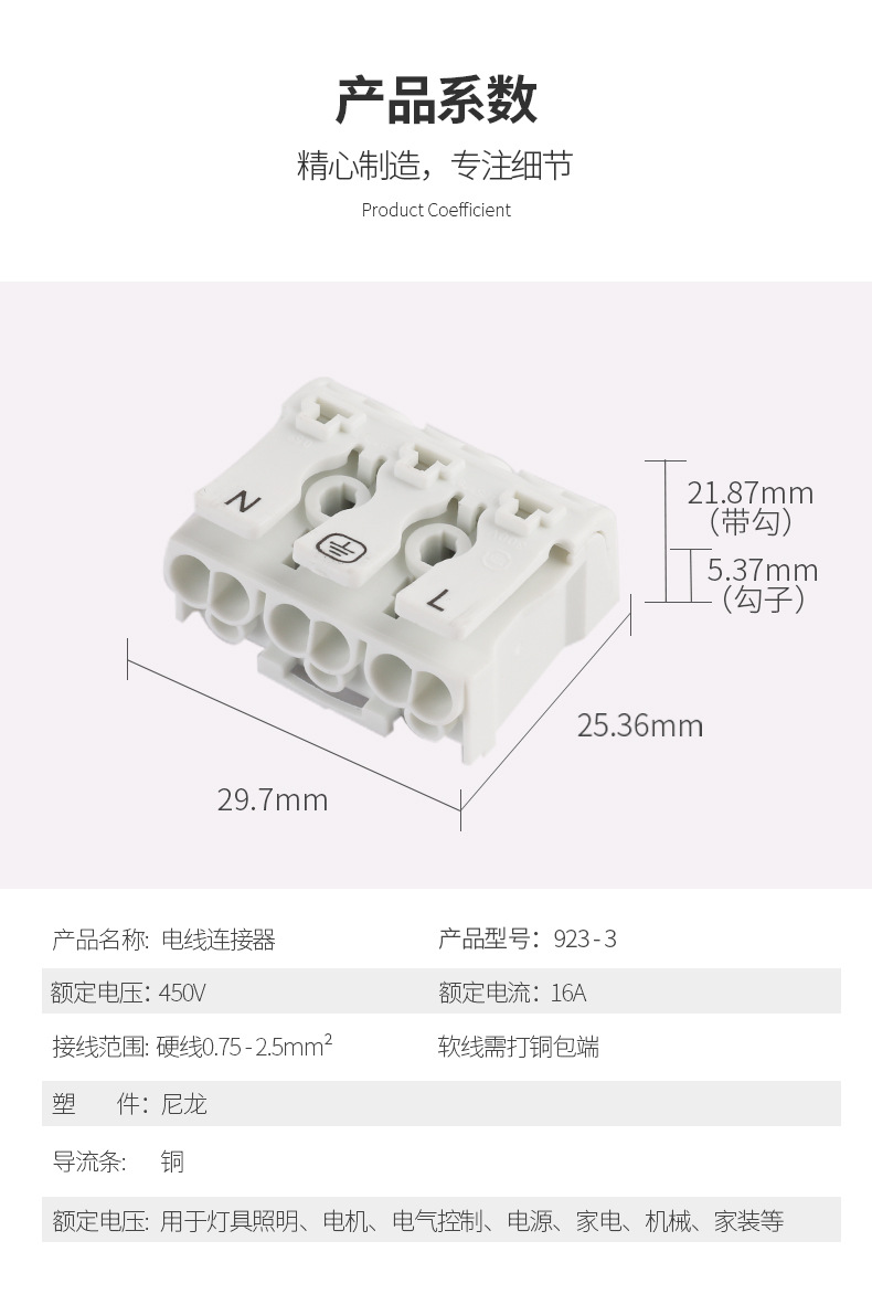 产品名称:923接线端子3P产品型号:923-3P适用导线:软硬导线 0.75-2.5mm^2技术参数:额定电压 450V 额定电流 24A产品尺寸:30*25*21mm(长*宽*高)产品材料:外壳 改性尼龙PA66 导流条 电解铜(表面镀锡) 弹片 301不锈钢
