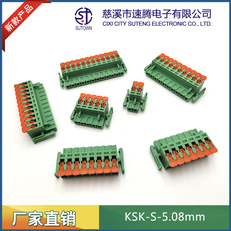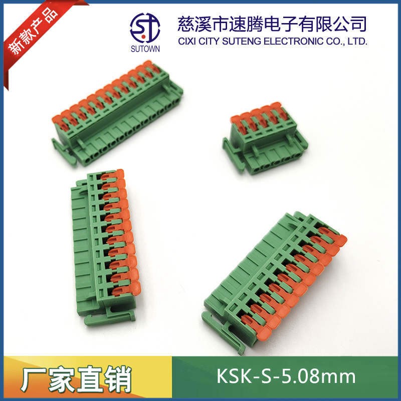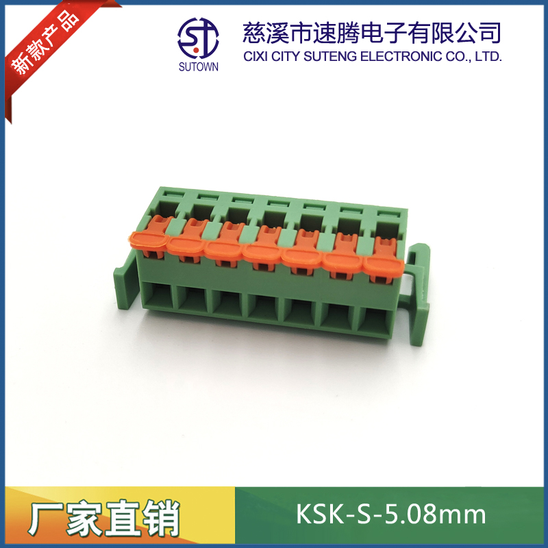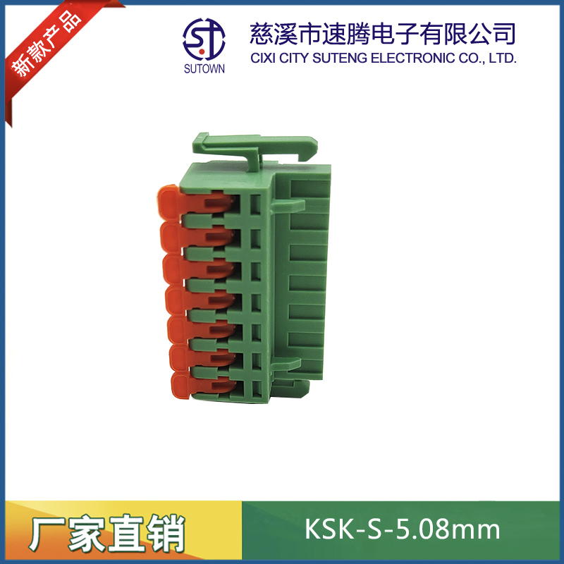 型号:KSK-S-5.08mm间距:5.08mm极数:2-24P电气性能 额定电压:300V额定电流:15A使用线径:24-12WG(2.5mm2)环境温度:-40℃~+105℃瞬时温度:+250℃,5s耐电压:AC4000V/Min接触电阻:20MΩ绝缘电阻:5000MΩ/1000V扭矩:0.4Nm剥线长度:7-8mm材质和电镀 塑件:PA66,UL94V-0触点材料:磷青铜,镀镍
