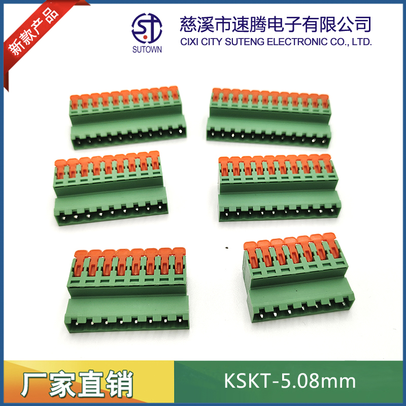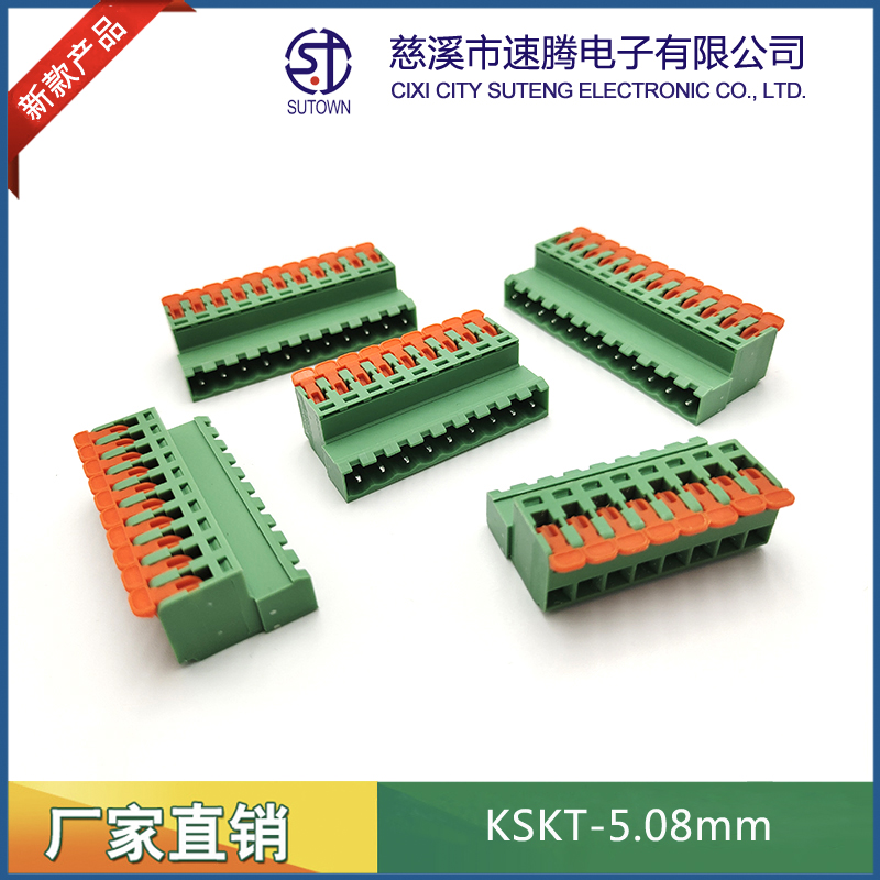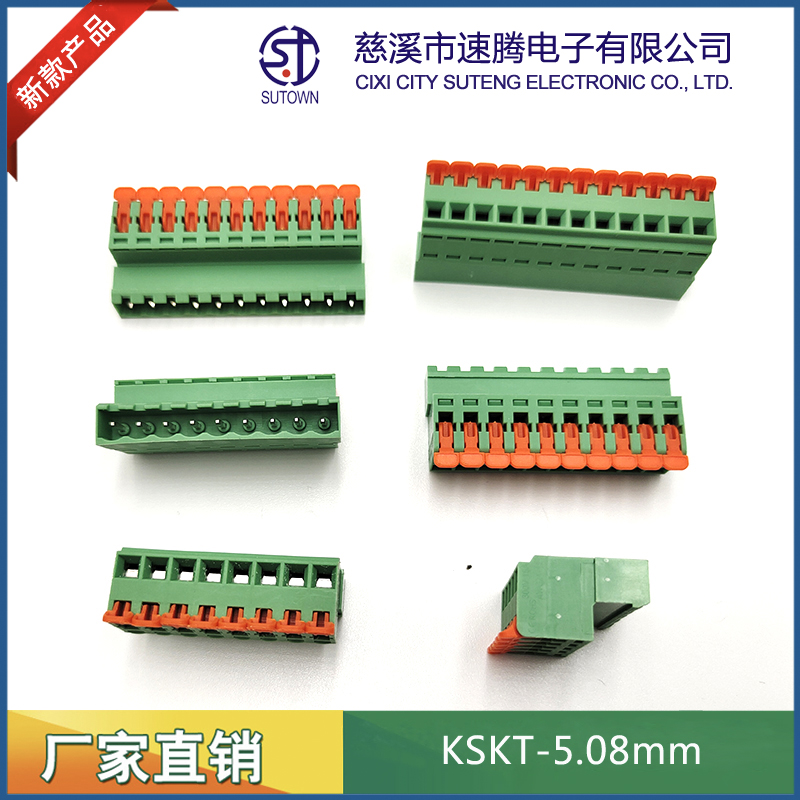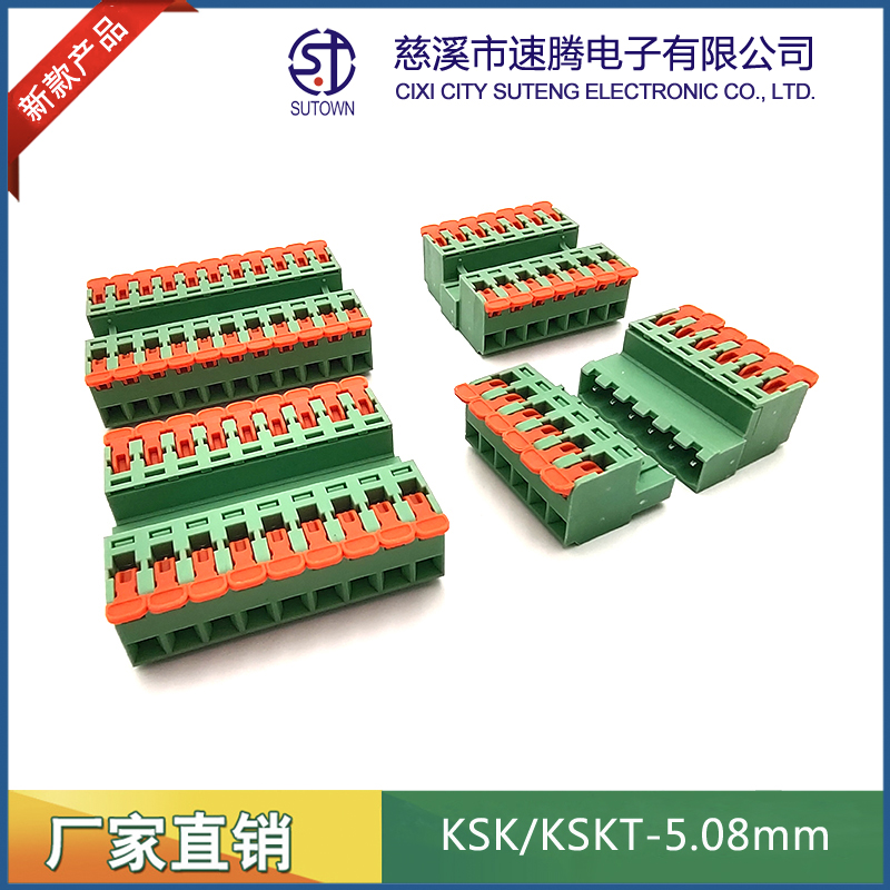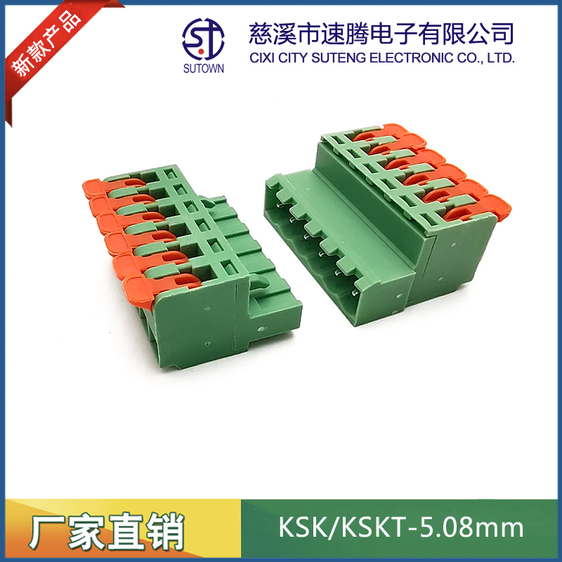 型号:KSKT-5.08mm间距:5.08mm极数:2-24P电气性能 额定电压:300V额定电流:15A使用线径:24-12WG(2.5mm2)环境温度:-40℃~+105℃瞬时温度:+250℃,5s耐电压:AC4000V/Min接触电阻:20MΩ绝缘电阻:5000MΩ/1000V扭矩:0.4Nm剥线长度:7-8mm材质和电镀 塑件:PA66,UL94V-0触点材料:磷青铜,镀镍