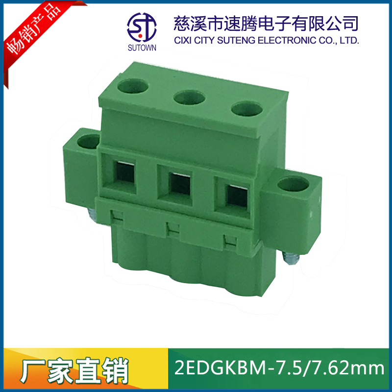材质及规格处理间距:7.5/7.62mm塑件:PA66 UL94V-0触点材料:磷青铜,镀镍螺丝:钢,M3.镀镍机械性能额定电压:300V额定电流:15A使用温度:-40℃~+105℃瞬时温度:+250℃,5s耐电压:AC2000V/Min接触电阻:20mΩ绝缘电阻:5000MΩ/1000V使用线径:28-12AWG 2.5mm2扭矩:0.4Nm剥线长度:7-8mm